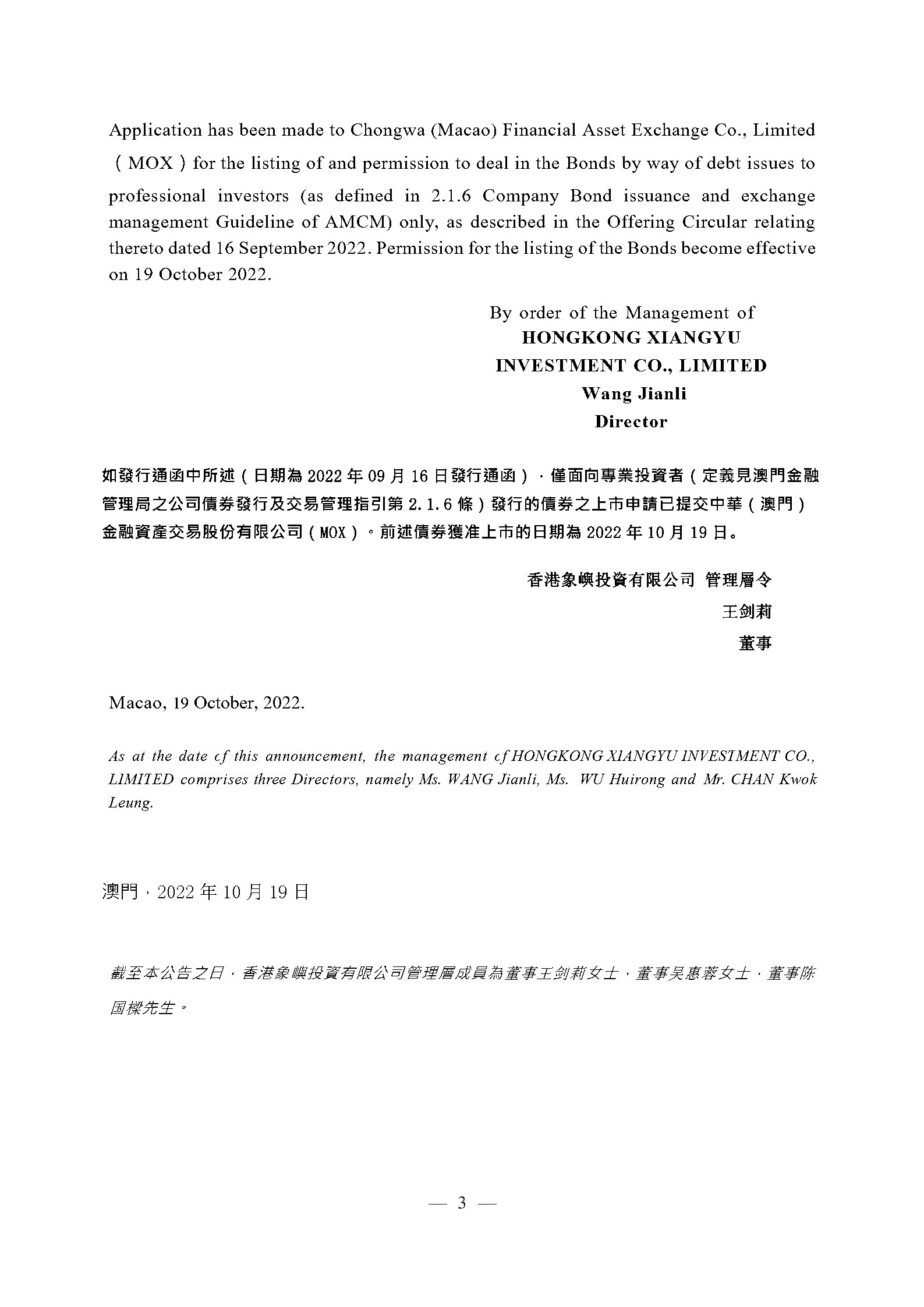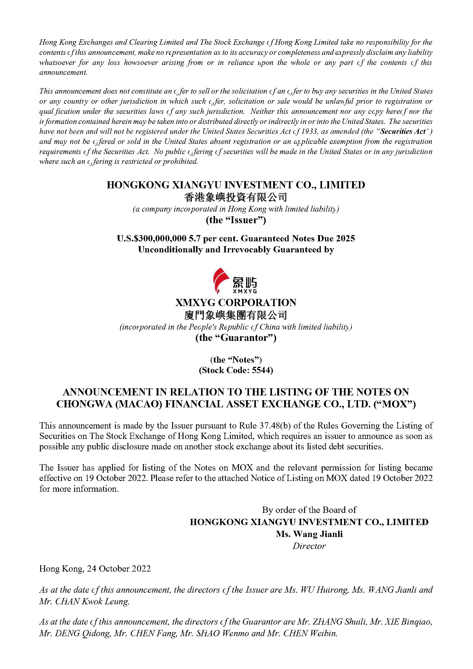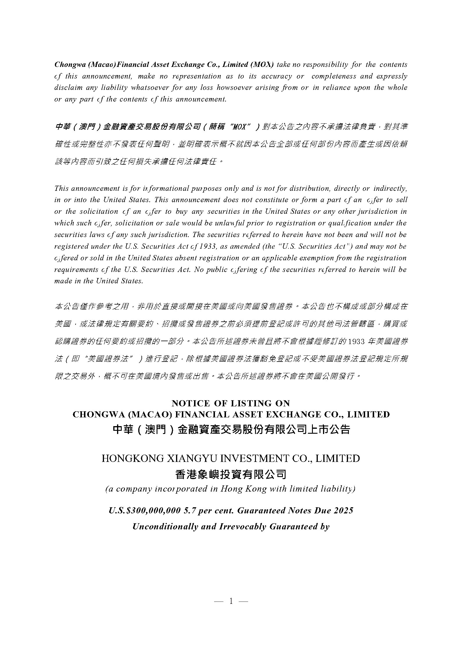 ANNOUNCEMENT IN RELATION TO THE LISTING OF THE NOTES ON CHONGWA (MACAO) FINANCIAL ASSET EXCHANGE CO., LTD. – HONGKONG XIANGYU INVESTMENT CO., LIMITED - U.S.$300,000,000 5.7 per cent. Guaranteed Notes due 2025