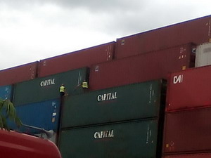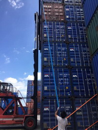 集裝箱堆積起來(lái)有20多米高,臺(tái)風(fēng)中,堆箱的穩(wěn)固性就顯得尤為重要。廈門、福州兩地的堆場(chǎng)早在前兩天就著手相關(guān)加固防護(hù)工作。8日白天,又有工作人員迎著大風(fēng)爬上樓頂檢查加固鋼架,不到臺(tái)風(fēng)來(lái)臨,時(shí)刻也不掉以輕心。