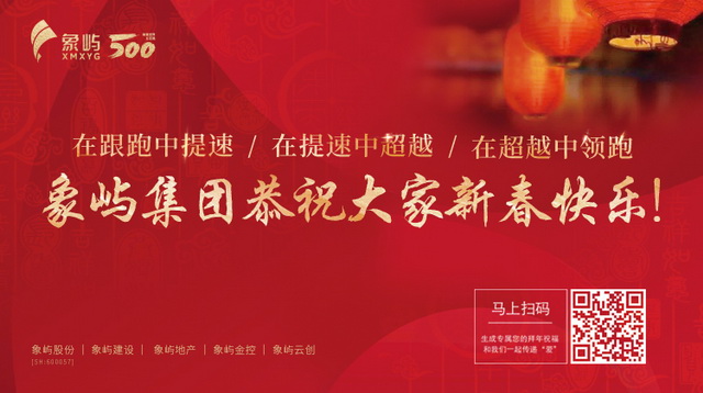 流轉(zhuǎn)的光陰,見證著奮斗者不曾停息的腳步;騰飛的中國,激蕩著創(chuàng)新者永立時代的潮頭。在新春佳節(jié)來臨之際,我們謹(jǐn)代表集團(tuán)各套班子向奮斗在海內(nèi)外各個工作崗位上的象嶼人、所有關(guān)心和支持象嶼事業(yè)發(fā)展的各級領(lǐng)導(dǎo)和社會各界朋友拜年,并通過你們向你們的家人致以節(jié)日的美好祝福!祝大家新春愉快!
