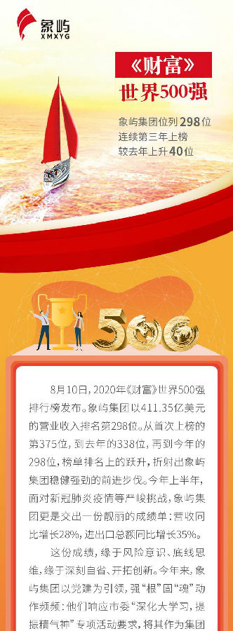 298位!前進(jìn)40名,象嶼集團(tuán)連續(xù)三年上榜《財(cái)富》世界500強(qiáng)