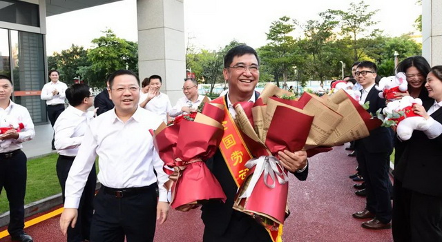 在象嶼集團(tuán)總部,員工們以鮮花和掌聲熱烈迎接全國(guó)勞模的歸來(lái)。“向勞模學(xué)習(xí),向勞模致敬!”口號(hào)此起彼伏,員工們興奮地紛紛搶著與勞模合影,留下珍貴的歷史瞬間。大家還舉起手中的“晨晨”公仔,齊聲祝福“象嶼集團(tuán)25周年生日快樂!再創(chuàng)新高!”,喊出了弘揚(yáng)勞模精神、勞動(dòng)精神、工匠精神,奮進(jìn)象嶼新征程的決心和信心!