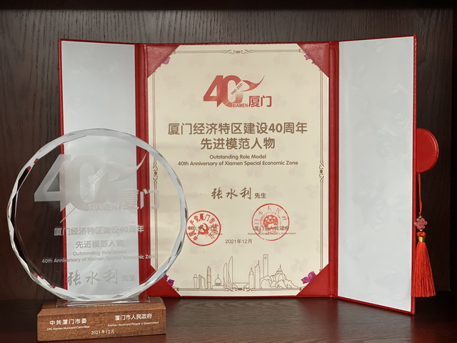 在這一特殊歷史時(shí)點(diǎn)上,廈門(mén)市委、市政府決定對(duì)為廈門(mén)經(jīng)濟(jì)特區(qū)建設(shè)作出突出貢獻(xiàn)的先進(jìn)模范人物和創(chuàng)新創(chuàng)業(yè)人物進(jìn)行表?yè)P(yáng)。全國(guó)勞動(dòng)模范、象嶼集團(tuán)黨委書(shū)記、董事長(zhǎng)張水利榮膺廈門(mén)經(jīng)濟(jì)特區(qū)建設(shè)四十周年先進(jìn)模范人物。