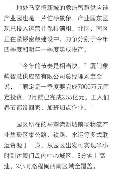 ‘公司在春節(jié)期間動員所有班組不停工,實際完成固定投資2.55億元。’廈門象嶼智慧供應(yīng)鏈有限公司黨支部書記、總經(jīng)理劉寶全介紹,當(dāng)前,公司正進(jìn)一步加快項目建設(shè),全力沖刺首季‘開門紅’。”